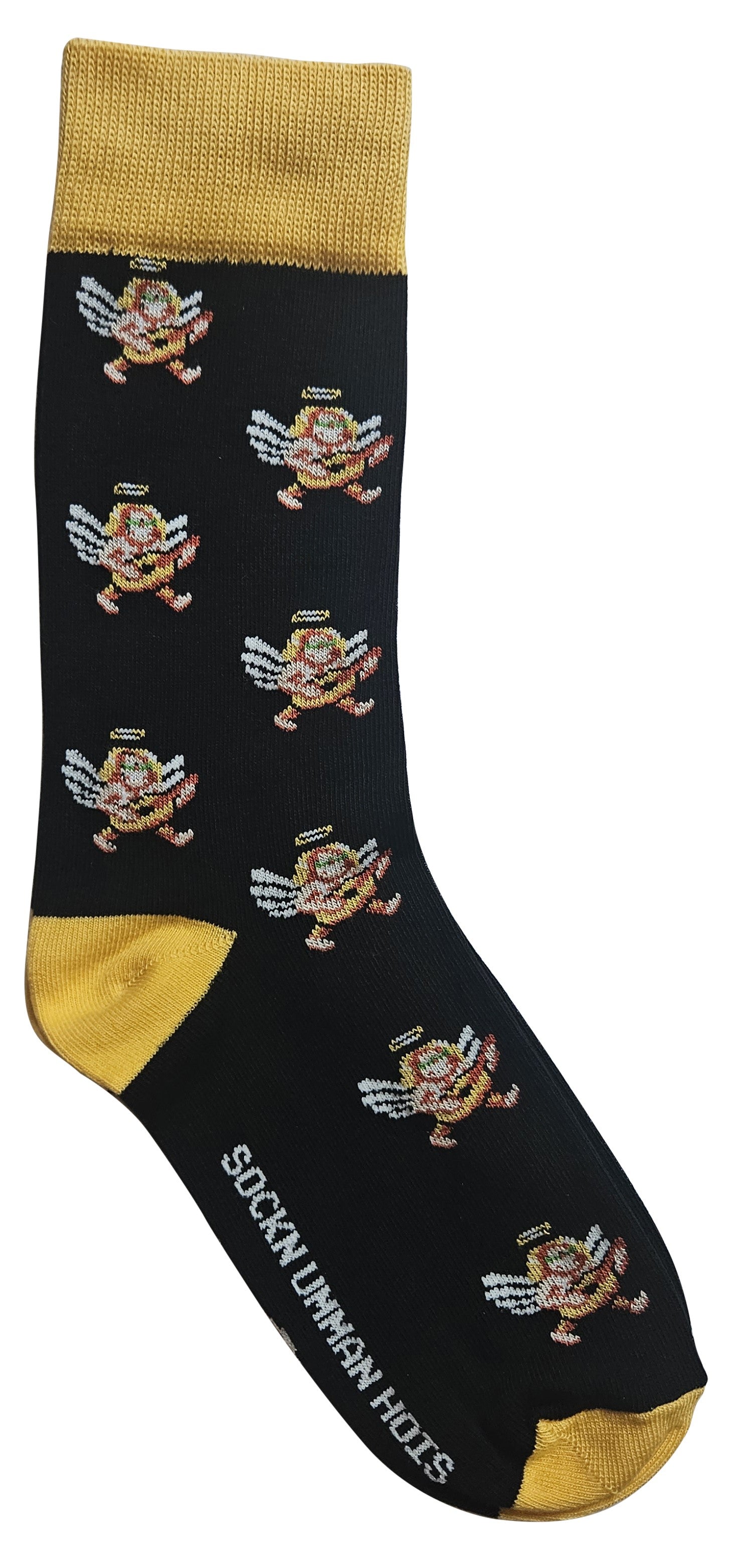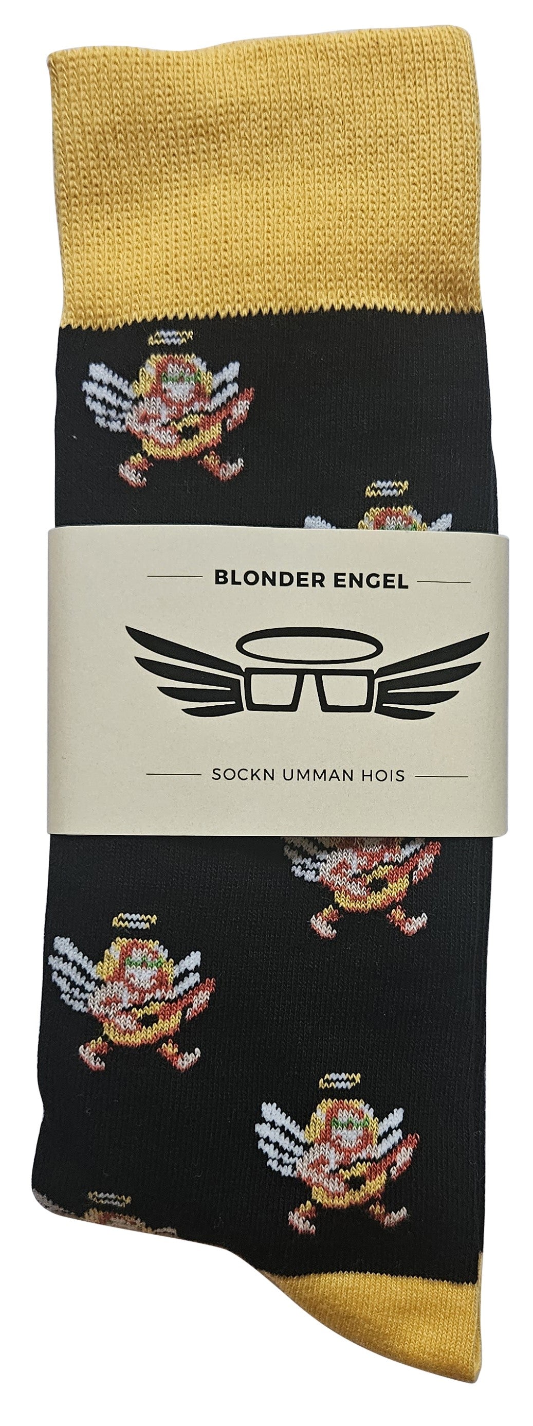 Socken in der Farbe schwarz/gelb mit Blonder Engel Motiv.