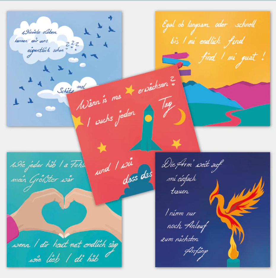 Fünf verschiedene Spruch-Karten auf nachhaltig produziertem, FSC®-zertifizierten Maispapier.